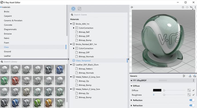 The V-Ray Material adds native support for metallic reflections (Metalness) for greater compatibility with PBR materials from applications like Substance Designer.