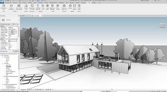 Use your Revit families as stand-ins for V-Ray proxy objects. These are memory efficient models of highly detailed objects like trees and cars.